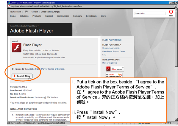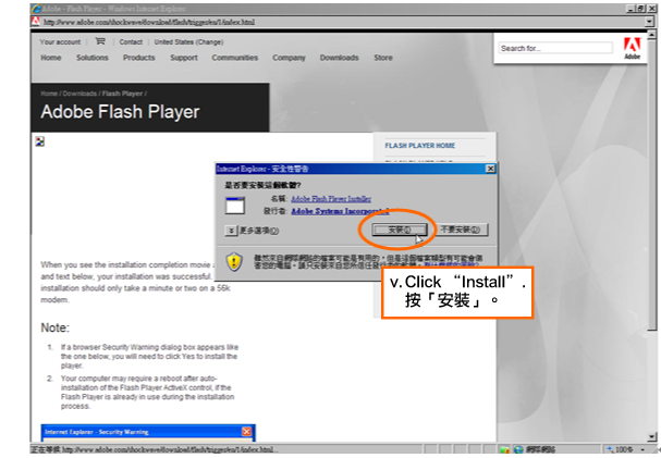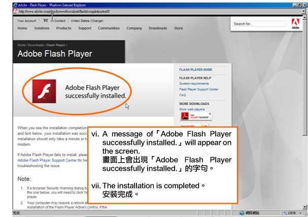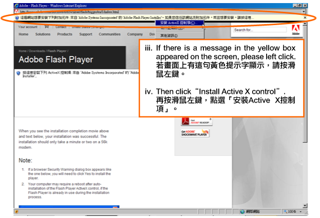 | 1. | You are not able to view the pictures or animation on the website because the Flash Player is not properly installed or it is not the most updated version. 未能顯示網站圖片或動畫的原因,主要是由於Flash Player仍未妥善裝置,或不是最新版本。 Solutions: 解決方法︰ Please go to the website of Adobe Flash Player Download Centre to download the relevant program software. If you want to install it now, please click Adobe Flash Player and complete the installation according to the following procedures. 到Adobe Flash Player Download Centre下載並安裝有關程式軟件。若現在要安裝,可點選Adobe Flash Player,並按以下程序完成安裝。 Installation procedures: 安裝程序︰ |