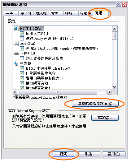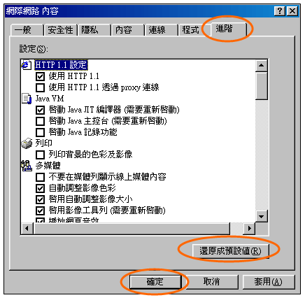 | e. | Click the Advance tab, then choose the “Reset to the Defaults” button. 再點選「進階」一項,並選擇「還原成預設值」按鈕; |