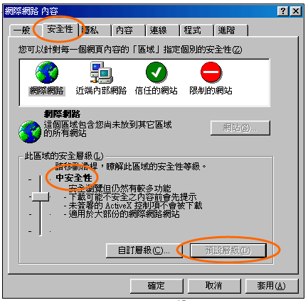 | d. | Choose the “Medium Level Security” setting and then press the Default Level button. 選擇「中安全性」設定,並點選「預設層級」按鈕; |
